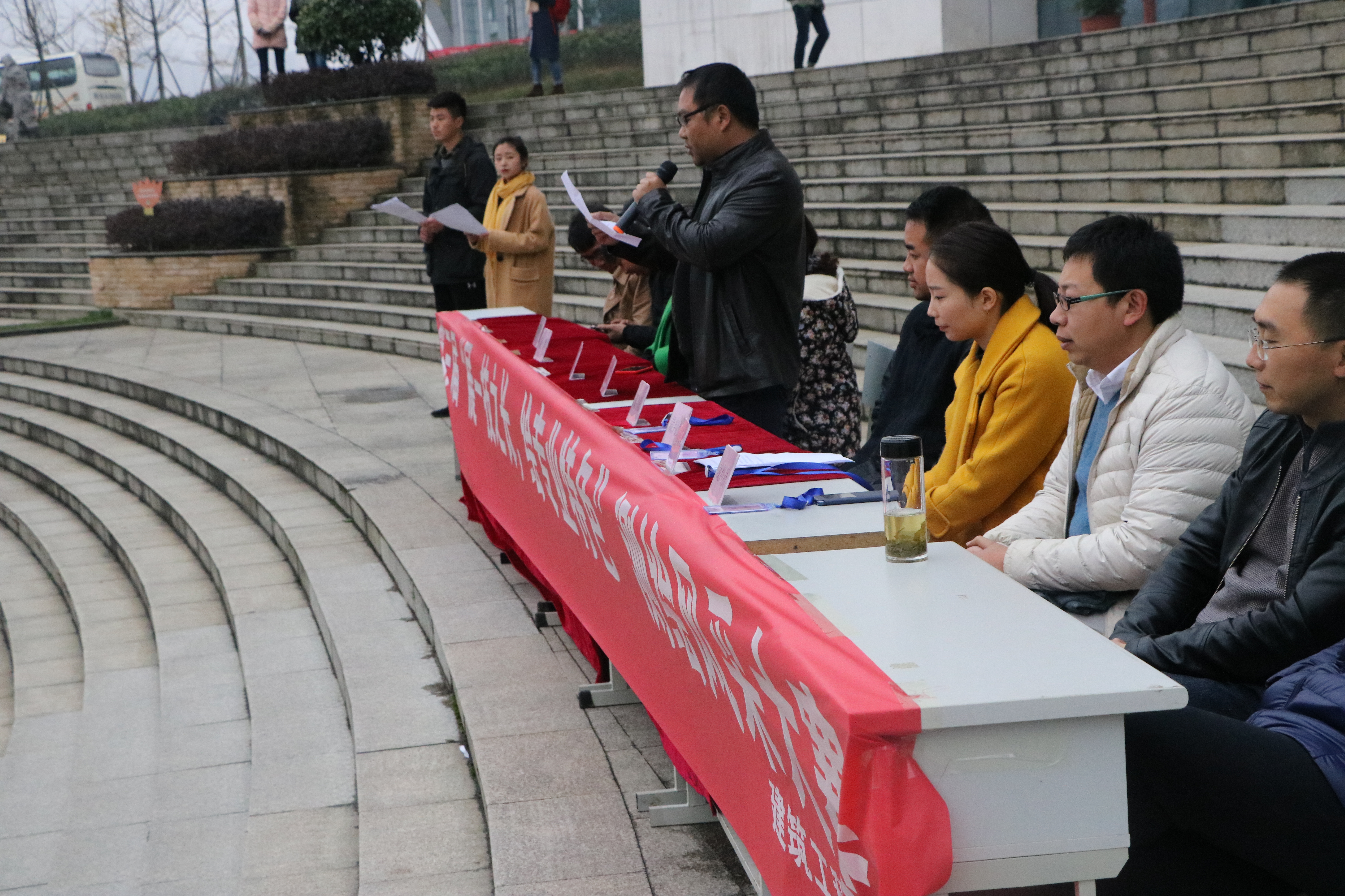 本次大赛参加开幕式的嘉宾有:建筑工程学院院长、党总支书记胡群、党总支副书记侯小玲、副院长罗之军、团总支邓福啦以及全体辅导员老师,首先,副院长罗之军致开幕词,然后裁判老师李梅宣誓,参赛队员何云宣誓,最后胡院长宣布比赛开始。