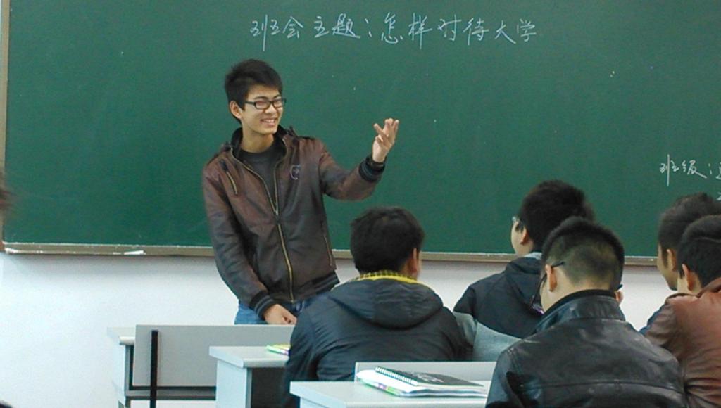 班会以同学们集中反映目前班上存在的问题拉开序幕,同学们纷纷反映这学期班风学风比较涣散,有些同学经常会出现迟到旷课的现象,根据这些现象,班长刘文涛自然而然的引导大家过渡到“怎样对待大学”的班会主题上来,学习委员瞿含带头发言“大学不想初中高中,老师不会天天催你学习。大学的学习完全就是师傅领进门,修行在个人。”纪律委员赵涛认为“现在很多同学每天就是睡觉打游戏,不愿意上课,根本原因就是自己已经丧失了奋斗目标,不知道自己应该做些什么!”