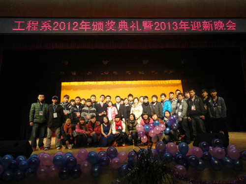 辞旧迎新之际,为营造我系和谐氛围,增进师生交流,展现我系风采,2013年12月21日14:30“工程系2012年颁奖典礼暨2013年迎新晚会”在我校大礼堂正式拉开帷幕。莅临晚会的嘉宾有系党总支书记周吉萍、系主任韩跃武、团支部副书记陈娜、系教学秘书叶飞及各班辅导员等。