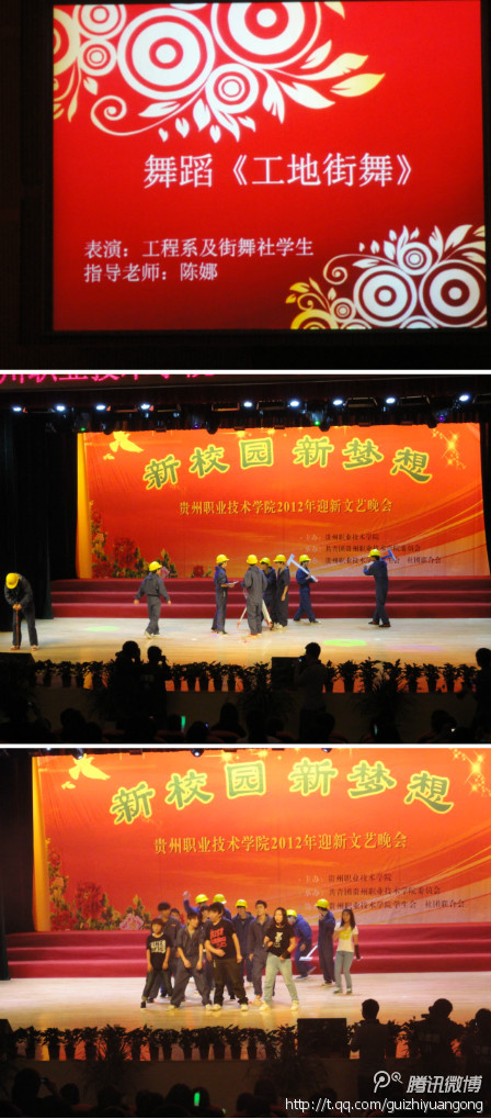 在《贵州职业技术学院2012级迎新晚会》上。我们工程系动感的工地街舞。代表了我们在工程上一样有活力。一样的激情。!!