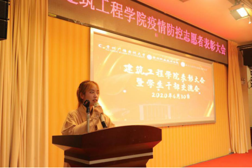 胡群院长上台宣布复学期间荣获疫情防控志愿者名单及在自己家乡疫情防控第一线的优秀志愿者名单。她表示在疫情防控最吃紧阶段,建工学院体现了大学生的责任与担当。积极响应学校和团委号召,踊跃投身到疫情防控志愿者服务活动中去,践行了中国当代青年的担当精神。
