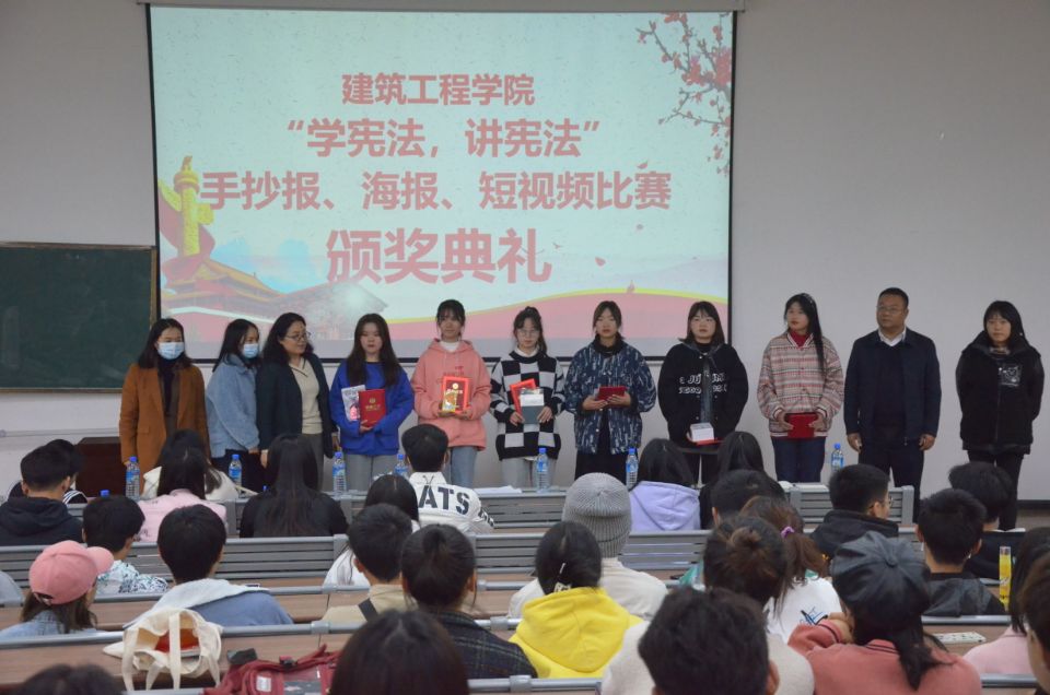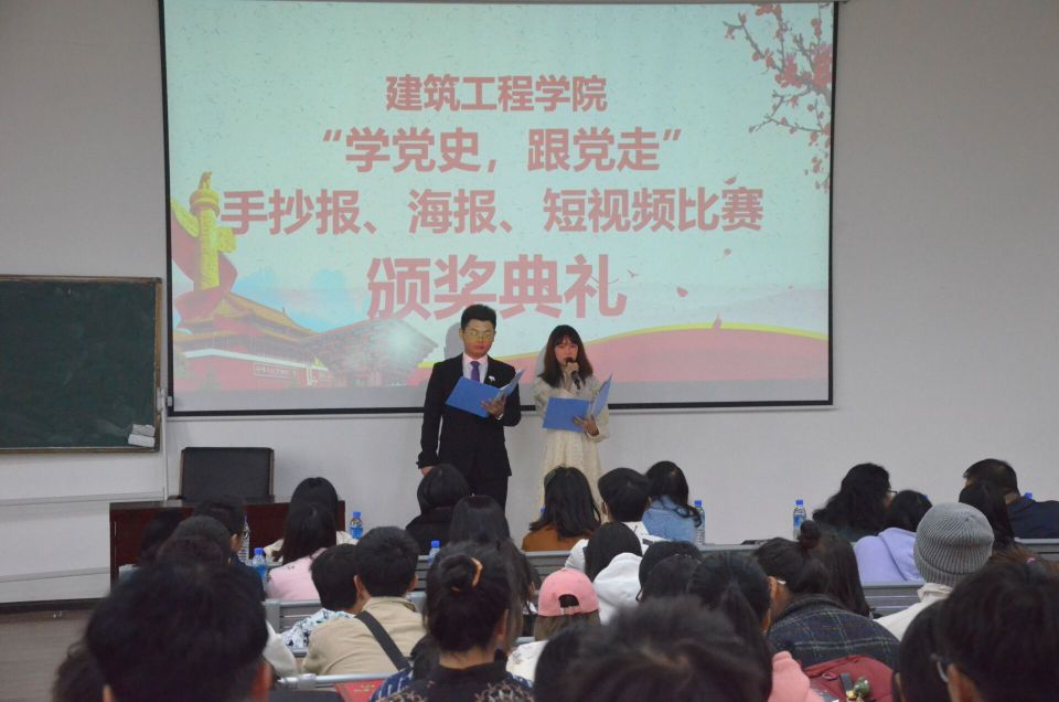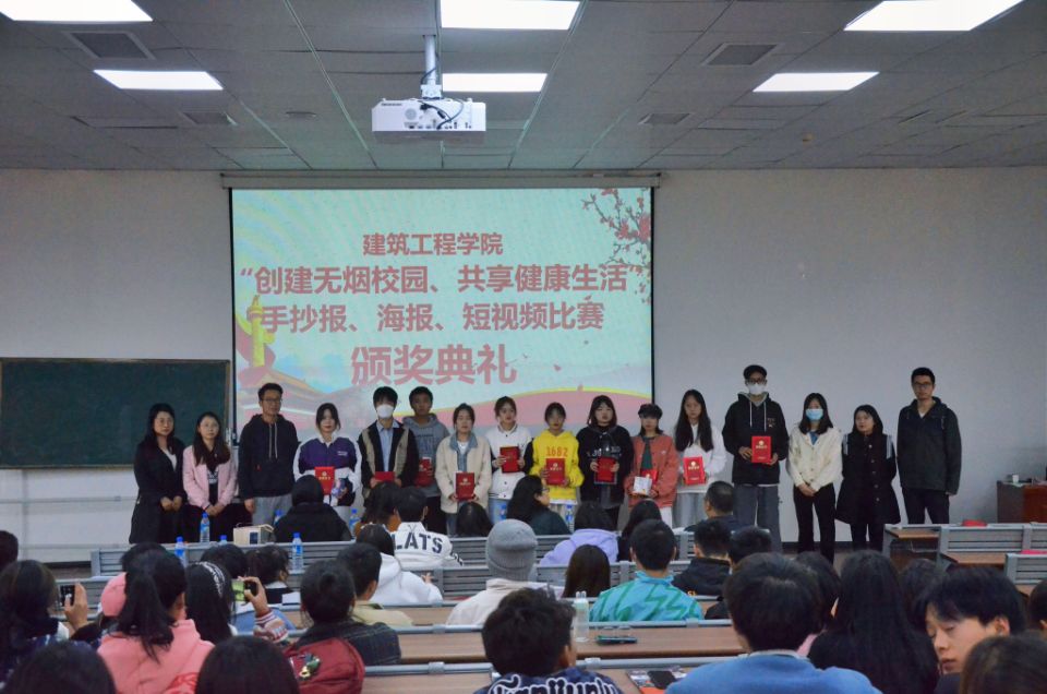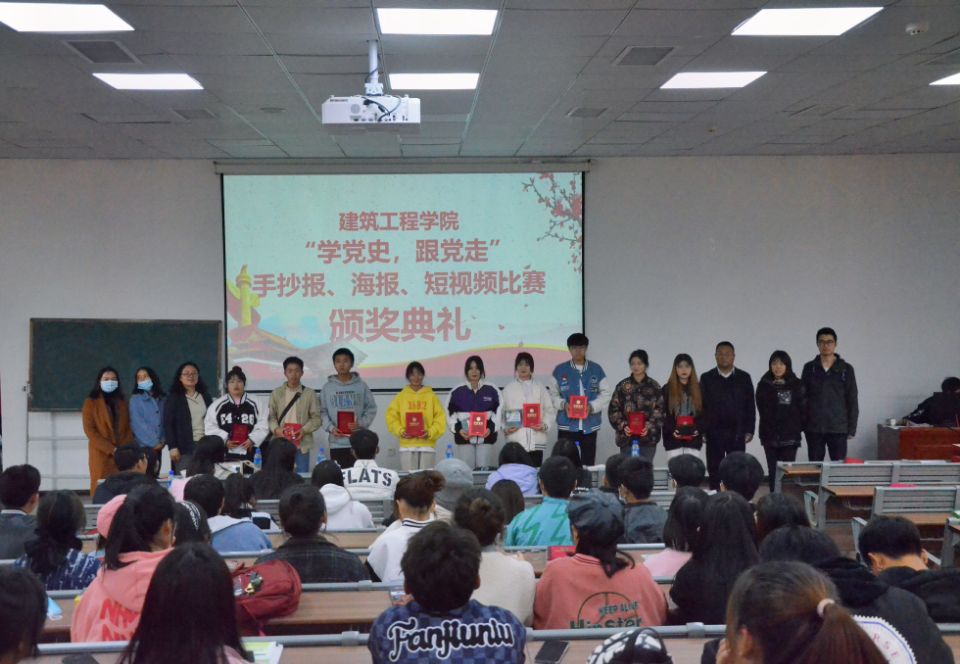 为了加强大学生素质教育,展现大学生才艺,同时做好宣传教育,建筑工程学院于2021年10月16日-27日举办了集宪法知识宣传、无烟校园倡议、党史学习教育于一体的“手抄报、海报、短视频”比赛。并于10月27日中午1点在科研楼229阶梯教室举行了颁奖典礼,对这次活动进行总结和表彰。参加颁奖典礼的有建筑工程学院党总支书记罗之军、各位辅导员老师及所有参赛人员。