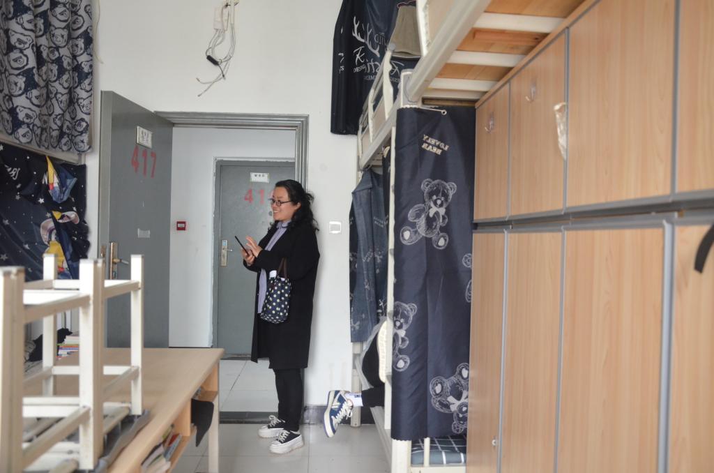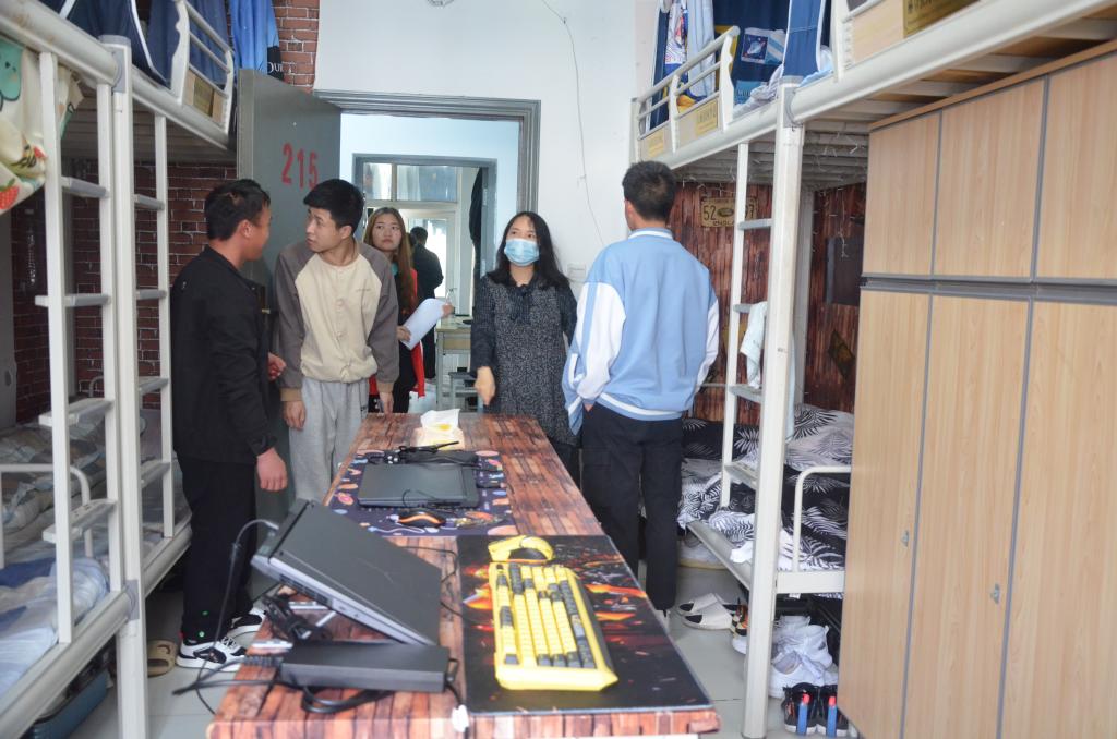 师生们分为5个组对学院全体宿舍进行了全覆盖检查。各小组重点排查了学生寝室内是否存在违规电器、管制刀具、私拉乱接电线、吸烟等安全隐患,检查了寝室卫生状况和消防设施情况。检查过程中,辅导员老师们与学生们进行亲切交谈,了解学生们在宿舍生活中存在的问题和意见建议,叮嘱同学们重视疫情防控、寝室安全、卫生工作,做到寝室成员互助互爱,合力营造一个安全、健康、舒适的学习和生活环境。