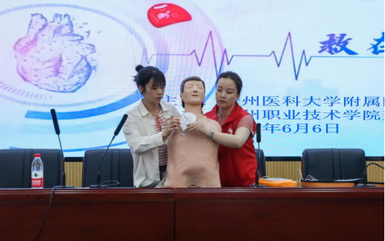 活动分为两个环节,第一个环节是心肺复苏科普知识宣教,首先由贵州医科大学副主任医师谢登海进行《冠心病危险因素及防治》的讲座,谢主任详细阐述了我国心血管病的现状并不乐观现患人数大约为2.9亿,主要危险因素包括吸烟、高血压、OSAHS、高血脂、高尿酸血症等方面,健康的生活方式是预防冠心病的要点。接着,郑小香医生进行了《猝死》的讲解,让学生了解到猝死的病因,学会心肺复苏指南要点,现场医生还演示了AED,示教除颤器的使用方法。第二个环节是CPR实操培训,在贵州医科大学附属医院医护人员的指导下,让学生进行了心肺复苏应急救护的实操练习,使其通过实操能够牢固掌握包括判断是否丧失意识、判断有无自主呼吸、判断有无脉搏、进行胸外心脏按压、清理口腔异物、开放气道、人工呼吸等心肺复苏的操作要领。