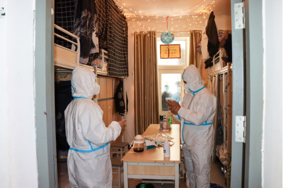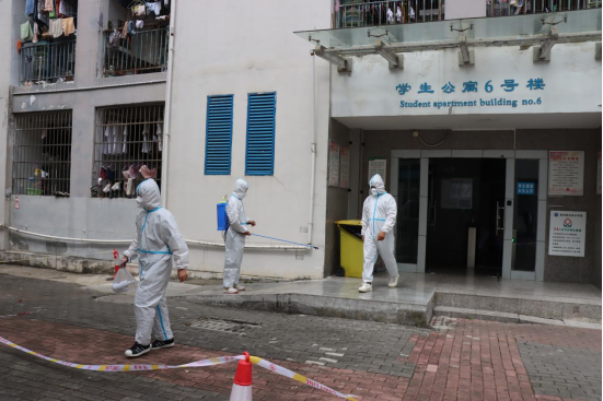 本次演练模拟场景是在学生公寓6栋一名同学被判定为核酸检测初筛阳性人员。学院收到校防控办通知后,立即启动应急机制,第一时间联系该生,了解其所处地点和周围情况,请该同学做好个人防护,同寝室人员做好防护原地待命。转运隔离组人员立即穿好防护服,到出现核酸检测阳性同学的寝室,将该名学生带离到指定隔离地点后,再次对该寝室人员进行体温、核酸检测。与此同时,根据学院应急处理机制,各小组负责人配合做好流调、转运、管控、消杀等处置工作。