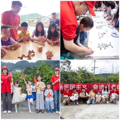 在黎安村,实践团向小朋友们开展鲁班锁、剪纸教学,科普中国古建筑知识和中国剪纸艺术,让小朋友体验中国非遗文化。以“童心向党,强国有我”为主题,让小朋友们通过绘画抒发爱国之情,开设旗帜知识小课堂,小朋友们课后与红旗合影,引导青少年儿童深入了解党和国家,传承红色基因,厚植爱国情怀,争做时代好少年。实践团成员深情地为当地小朋友讲述《折纸飞机的男孩》“中国航天之父”钱学森的故事,并通过折飞机活动将爱国情传递给儿童,让爱国情、报国梦在“指尖上”传承。