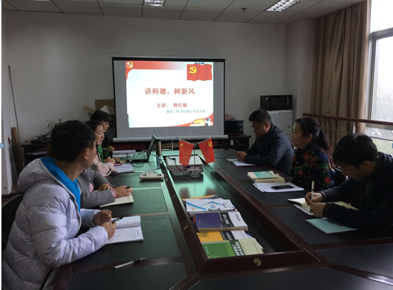 为顺利推进 “两学一做”学习教育,加强支部党员的学习意识,2016年11月1日建筑工程学院辅导员党支部在322会议室组织了一次以“讲师德,树新风”为主题的党课教育活动,主讲人周红娟老师,全体辅导员参加。