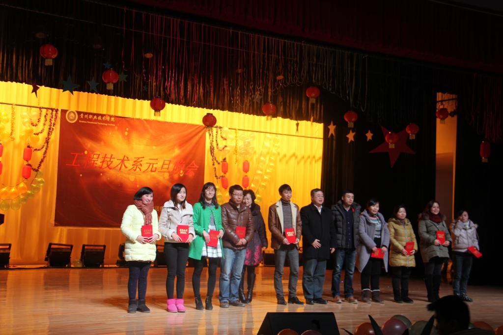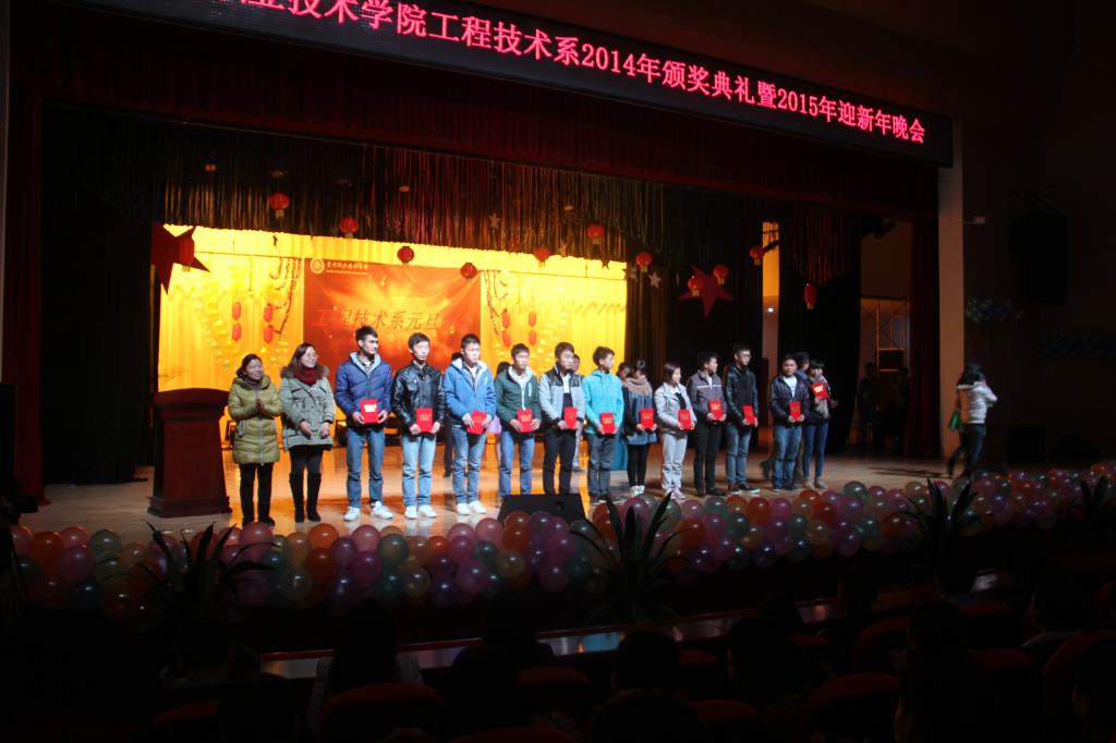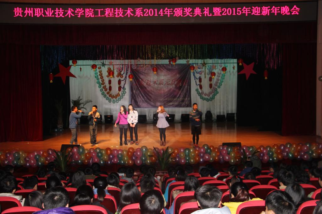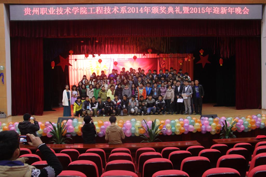 光阴流转,时光飞逝,难忘的2014年即将过去,崭新的2015年即将到来。2014年12月15日晚上19:00“贵州职业技术学院工程技术系2014年颁奖典礼暨2015年迎新年晚会”在我校大礼堂拉开帷幕。参加此次晚会有系党总支书记周吉萍、系主任韩跃武、团总支副书记陈娜、专业教师、全体辅导员老师以及全系学生。
