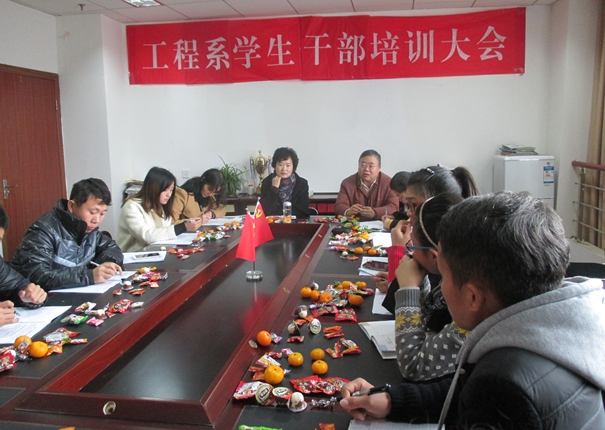 学生干部是学生管理的重要力量,是学生的形象代表,是学校众多活动中的组织者与领头人,为了更好的提高学生干部素质,让他们在同学当中做好带头作用。工程技术系于2014年11月21日下午14:30在行政楼322会议室召开了学生干部培训大会。大会由系团总支书记陈娜老师主持,系党总支书记周吉萍、系主任韩跃武出席了本次培训会。