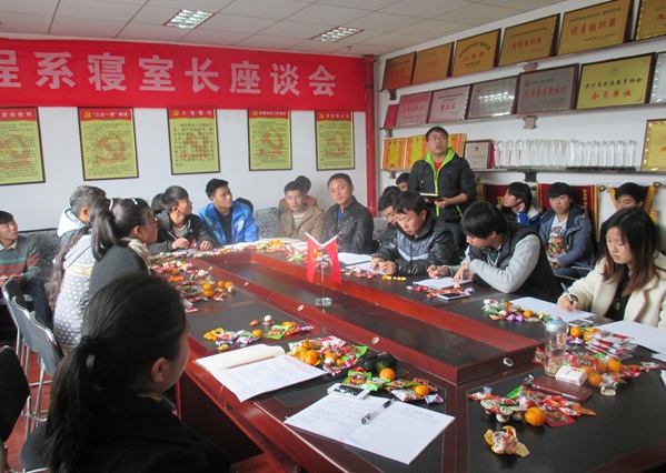 为了培养同学们的团结意识,调动广大同学对寝室内务、卫生工作的积极性,增强同学们自主生活意识,提高同学们的生活质量。工程技术系于2014年11月20日下午14:30在行政楼322会议室举办了寝室长座谈会。此次会议由系团总支书记陈娜老师主持,系党总支书记周吉萍、系主任韩跃武、全系辅导员及各班寝室长代表参加会议。