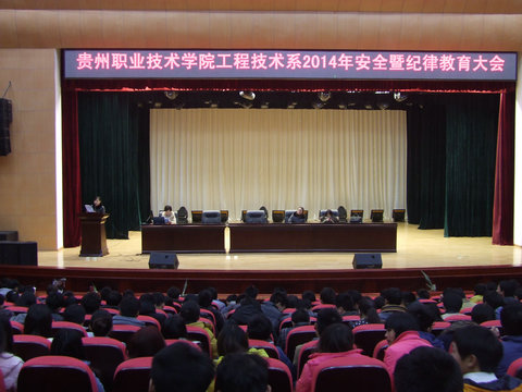为认真贯彻落实贵州省加强各高校学生安全教育的精神,提高学生的自我保护意识,认真做好学校的安全稳定和纪律教育工作,贵州职业技术学院工程技术系于2014年3月10日下午14:00在学校礼堂召开了“工程技术系2014年安全暨纪律教育大会”,此次大会由系团支部书记陈娜老师主持,辅导员及全体学生参加。