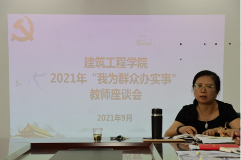 根据学校《关于开展“赓续百年初心, 担当育人使命”教师节“三走进”系列活动的通知》文件精神,建筑工程学院于9月14日召开了主题为“我为群众办实事”的教师座谈会,走进教师身边,解决急难愁盼的问题,座谈会由院长胡群主持。
