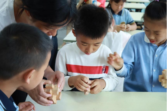 工作室黄鹭老师指着侗族鼓楼建筑模型向孩子们讲解中国传统建筑文化,以及木结构建筑的基本搭建方式,孩子们对榫卯结构有了浓厚的兴趣,借助“鲁班锁”,同学们在学生志愿者的帮助下,初领古代匠人的建筑智慧。
