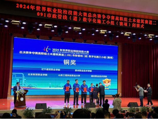 10月27日, 2024年世界职业院校技能大赛总决赛争夺赛高职组土木建筑赛道二091市政管线(道)数字化施工赛项争夺赛在重庆建筑工程职业学院举办,由我院建筑工程学院罗武德、吴兴华两位指导老师带领周健康、敖荣坤、马楠和李欣洁四位同学代表我校参赛,他们凭借扎实的专业技能、出色的团队协作和顽强的拼搏精神,荣获本次全国赛铜奖。