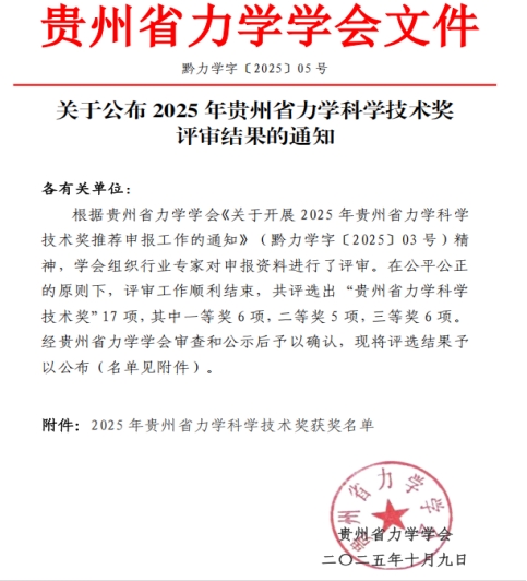 近日,贵州省力学学会发布《关于公布2025年贵州省力学科学技术奖评审结果的通知》(黔力学字〔2025〕5号),我院教师谢财进荣获贵州省力学科学技术奖“一等奖”。