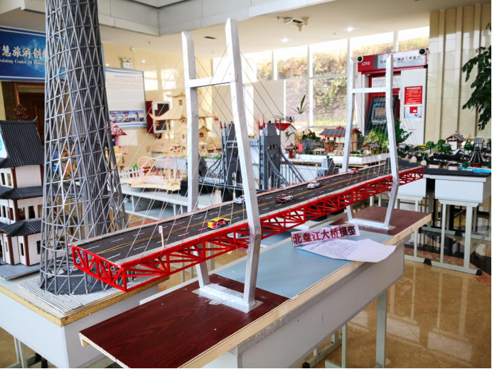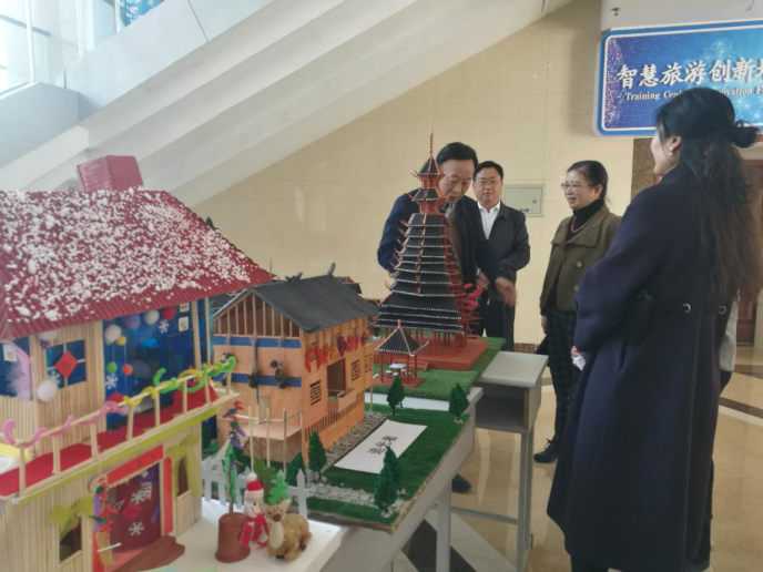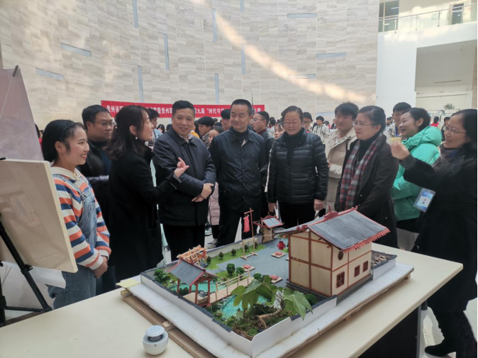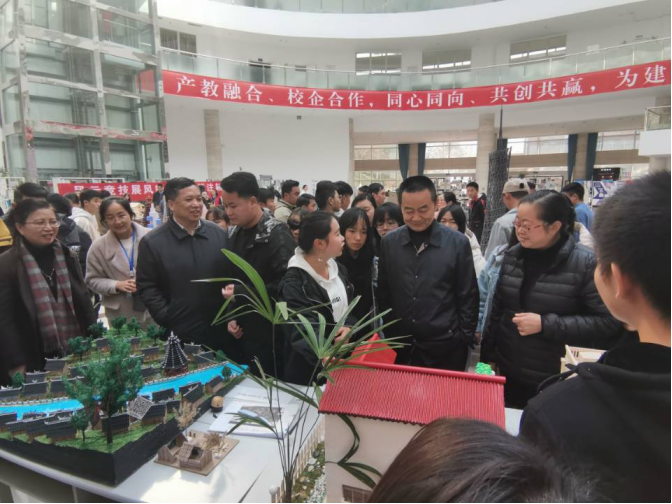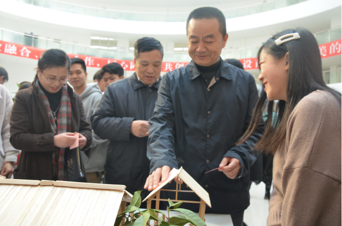 郭万才副书记以及校纪委书记骆最勇在模型作品展览现场进行指导