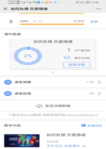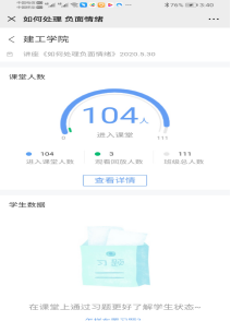 荣光副院长使用雨课堂直播功能对返校复学的111名同学进行了线上线下同步直播。她从认识情绪,觉察情绪,处理情绪三个方面进行讲解,采用启发式提问、小游戏互动、体验式的角色扮演等多种形式和同学们进行了将近两小时,干货满满、丰富多彩的讲座。短短的两小时同学们在弹幕上留言、互动和投稿累计104次。最后整场讲座在欢乐的合影中结束,同学们通过本场讲座掌握了情绪的来源,获得了调节负面情绪的方法,汲取了满满的正能量。