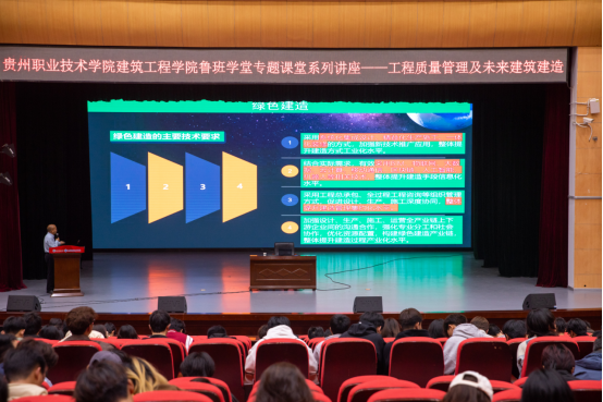 随着科技的飞速发展,建筑行业正面临着前所未有的挑战与机遇,工程质量管理作为确保建筑工程成功的关键因素,其重要性日益凸显。同时,未来建筑建造的趋势也在不断演变,为适应可持续发展、智能化和绿色建筑的需求,结合建筑工程学院各专业特点,2024年4月22日下午,我院邀请了工程技术应用研究员,国家注册一级建造师谢文辉老师在大礼堂开展了以“工程质量管理及未来建筑建造”为主题的鲁班学堂专题讲座,建筑工程学院党委副书记荣光、教职工代表及本、专科学生参加了本次讲座。