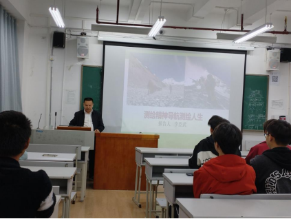 李臣武老师先后介绍了北斗女神王淑芳、丈量祖国壮美河山的国测一大队、测绘战线上闪亮坐标——明阳以及全国技术能手杜国福的先进事迹和感人故事,并进一步阐述了“热爱祖国、忠诚事业、艰苦奋斗、无私奉献”的十六字测绘精神。李老师结合党的十八大以来我国测绘地理信息事业在技术、装备、系统等各方面的发展成就,号召同学们积极投身到测绘行业中,以“螺丝钉”的精神当好排头兵,用精益求精的匠心做好“绣花匠”,用披荆斩棘的胆气争当“开拓者”,用日积月累的沉淀当好“引路人”,为祖国宏大的测绘事业添砖加瓦。