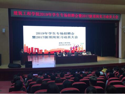 2019年5月10日下午,建筑工程学院在大礼堂召开2019年学生专场招聘会和2017级顶岗实习动员大会。参加此次动员大会的领导和嘉宾有建筑工程学院党总支书记、院长胡群老师,党总支副书记、副院长罗之军老师,学院全体老师、进行宣讲的企业负责人和2016级和2017级全体同学,大会由张艺方老师主持。