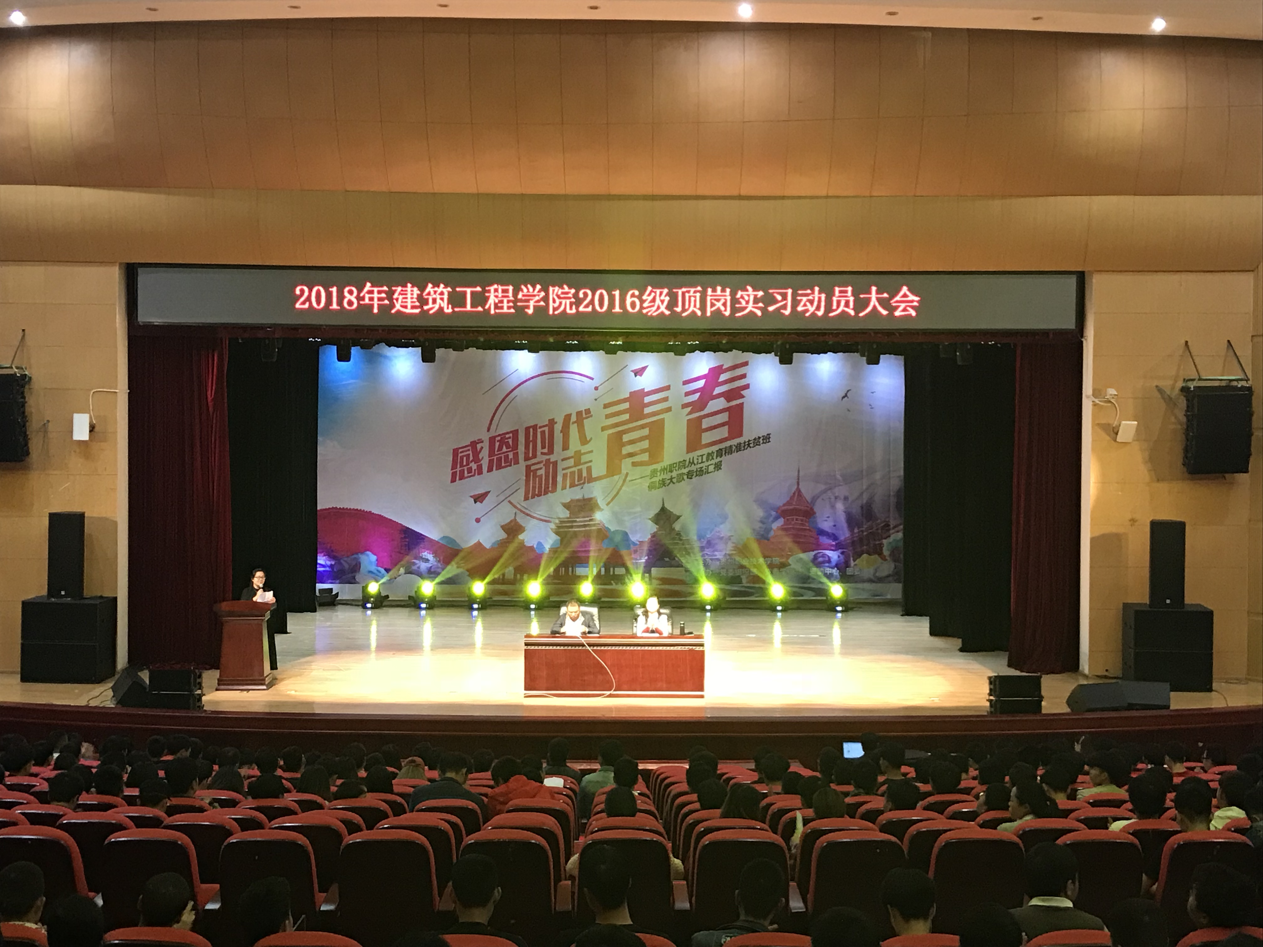 在2016级学生即将结束在校学习进入顶岗实习培养环节之际,2018年6月1日下午,建筑工程学院在大礼堂召开2016级学生顶岗实习动员大会。参加此次动员大会的领导和嘉宾有建筑工程学院党总支书记、院长胡群老师,副院长罗之军老师、学院全体老师、进行宣讲的企业负责人以及2016级全体学生,大会由刘佳蓉老师主持。