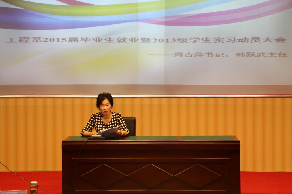 2015年6月25日上午9时,工程技术系2015届毕业生就业暨2013级学生实习动员大会在图书馆二楼报告厅举行。出席本次大会的有系党总支书记周吉萍、教师和辅导员代表、2015届毕业生及2013级学生代表。