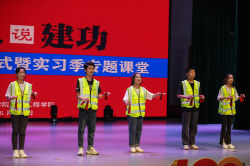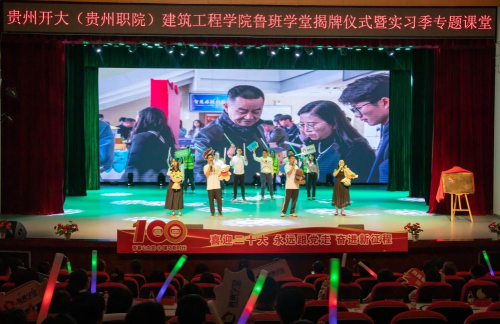 到场的领导共同为鲁班学堂揭牌,与在座师生共同见证这激动人心的时刻。在揭牌之际,鲁班学堂结合目前实习学生最重要和最关注的事情,开启了第一讲:建工人说建功。学堂邀请到了贵州大学城市与建筑规划学院梅世龙教授,贵州建工第八建设集团副总经理兼总工程师陈亮进行现场授课。整个活动通过学生快板说安全、企业现身说需求、专家专业说技能、教师歌唱说祝福,向建工学子送上精彩丰富的一课。