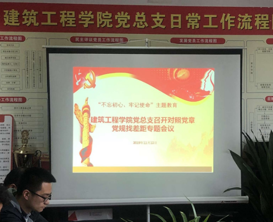 按照学校《关于在“不忘初心、牢记使命”主题教育中对照党章党规找差距的工作方案》要求,为贯彻落实习近平总书记的重要指示精神,组织引导党员以彻底的自我革命精神对照党章党规找差距。11月15日下午,建筑工程学院党总支再次开展“不忘初心、牢记使命”主题教育对照党章党规找差距专题会议。会议由学院党总支书记、院长胡群主持。