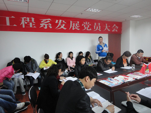 2013年4月11日,工程技术系党支部于行政楼322会议室召开了“工程技术系党员大会”,参加本次会议的有工程技术系党总支书记周吉萍、工程技术系主任韩跃武、全体党员、入党积极分子。会议的主要议程是讨论夏子林等19名学生入党积极分子发展为预备党员事宜,会议过程严肃、规范,每位发展对象宣读了《入党志愿书》的同时就进入大学后的思想、学习、工作、生活等方面向党组织进行了深入地汇报,第一介绍人和第二介绍人对发展对象的个人审查情况进行了介绍,并发表了意见。同时,也指出了发展对象的缺点和不足。