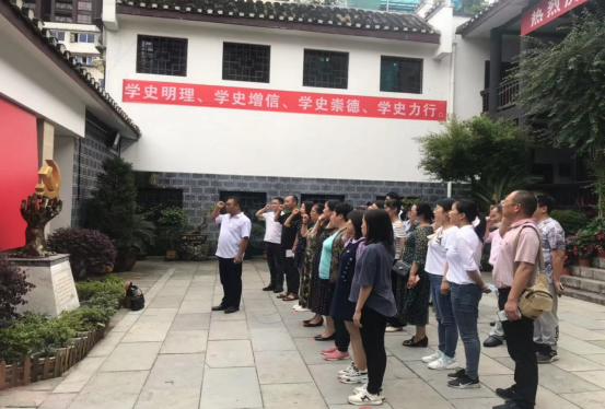 参观结束后,全体党员教师整齐列队,面对党旗,举起右手,紧握右拳,重温入党誓词。让党员干部追忆烽火连天的革命岁月,感悟无惧牺牲的革命精神,体会当下幸福生活的来之不易。