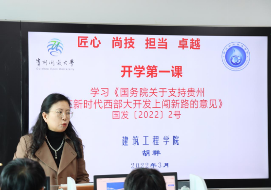 感恩奋进闯新路,昂首阔步新征程。2022年1月18日,国务院出台《关于支持贵州在新时代西部大开发上闯新路的意见》(国发〔2022〕2号),支持贵州“推动教育高质量发展”,给全省教育系统广大师生员工发来“新春大礼包”。以宣讲新国发2号文件为契机,3月17日,建筑工程学院院长胡群在慎行楼502教室给工程造价203班上了一门精彩的“开学第一课”。