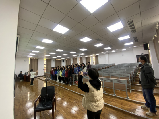 在科研楼一楼阶梯教室,林瑶和各位党员对合唱的排练效果表示充分肯定,并对师生们的辛苦付出表示慰问。叮嘱大家合唱是一个团队项目,需要每个同学相互配合,在紧张的学习之余努力练习,团结一致、再接再厉,继续在比赛中取得优异成绩,为学院争光,也更好的提升自己,做全面发展的大学生。