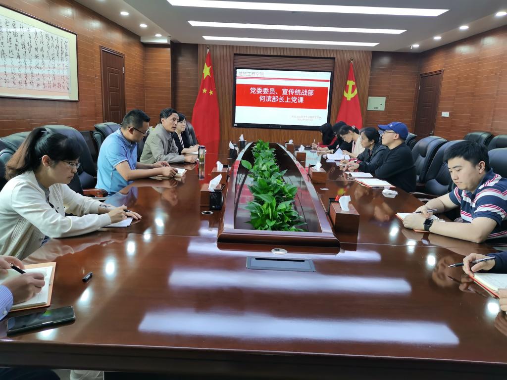 2022年6月14日,在我校行政楼8楼会议室,党委委员、宣传统战部何滨部长给建筑工程技术专业群党支部全体党员讲授了一堂生动详实的党课,建筑工程学院党总支书记林瑶、副院长周仕来一同听课。