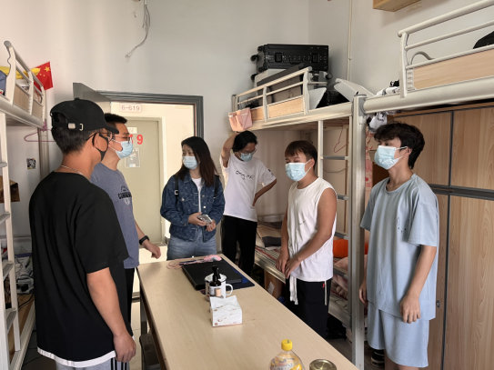 图为建筑工程学院党员先锋队成员走访寝室,了解同学们学习、生活情况