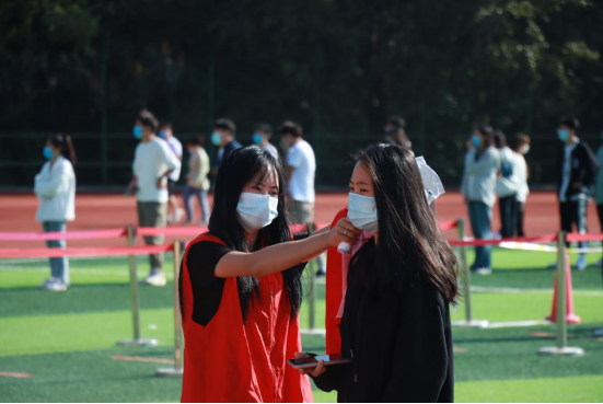 图为建筑工程学院党员先锋队成员在给学生测量体温