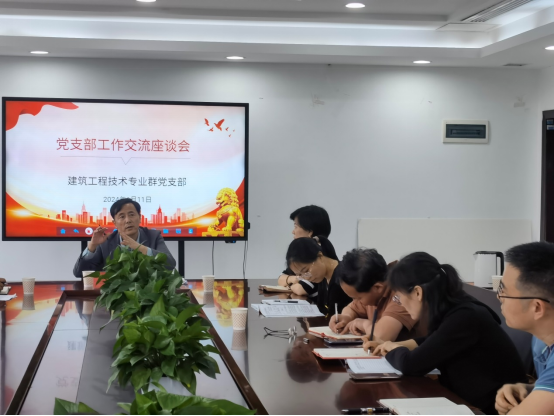 为进一步调研了解学院情况,加强与教师之间的联系,畅通双向交流渠道,2024年6月11日中午学校党委委员、党委宣传部部长何滨深入建筑工程技术专业群党支部开展党支部工作交流座谈会。