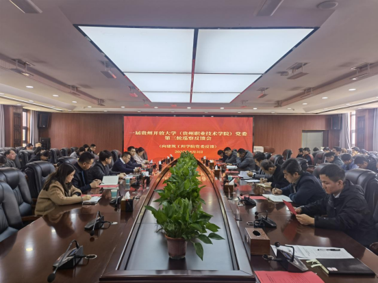 根据贵州开放大学(贵州职业技术学院)党委巡察工作领导小组的部署,2025年4月3日,学校党委第三轮巡察第三巡察组巡察建筑工程学院党委工作反馈会在综合楼三楼会议室召开。学校发展规划处处长、党委组织部副部长周涛,校党委第三巡察组组长周显龙,副组长张硕及其他巡察组成员出席会议。建筑工程学院党委领导班子成员、全院教职工、学生代表参加会议,会议由建筑工程学院党委书记罗之军同志主持。