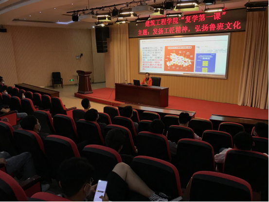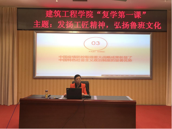 胡群院长以《发扬工匠精神,弘扬鲁班文化》为主题,重点讲授了三个方面的内容。一是讲述了在抗击疫情中的英雄事迹;二是作为高职学生怎样如何发扬工匠精神;三是如何在返校后做好学习生活规划和职业生涯规划。