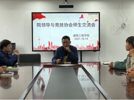 为推深做实党史学习教育,切实把学习成效转化为工作动力。建筑工程学院坚持以学生为中心,把学习党史同总结经验、对照现实、推动教学各项工作结合起来,同解决实际问题结合起来,扎实开展“我为师生办实事”实践活动。针对社团管理,2021年10月13日中午1点,建筑工程学院周院长与竞技协会全体学生在科研楼319开展了师生交流会。